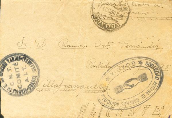 1936. GUADIX (GRANADA) a VILLAFRANQUEZA (ALICANTE). Marcas SOCIEDAD ACITANA DE OBREROS AGRICOLAS / GUADIX y SINDICATO DE OFICIOS VARIOS / C.N.T. / COMITE / A.L.T. / GUADIX (GRANADA), ambas en azul-negro. MAGNIFICA Y RARISIMA.