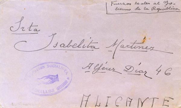 1936. IZNALLOZ (GRANADA) a ALICANTE. Anotación manuscrita "Fuerzas Leales al Gobierno de la República" y marca AGRUPACION SOCIALISTA / IZNALLOZ (GRANADA), en violeta y al dorso llegada. MAGNIFICA Y RARISIMA.