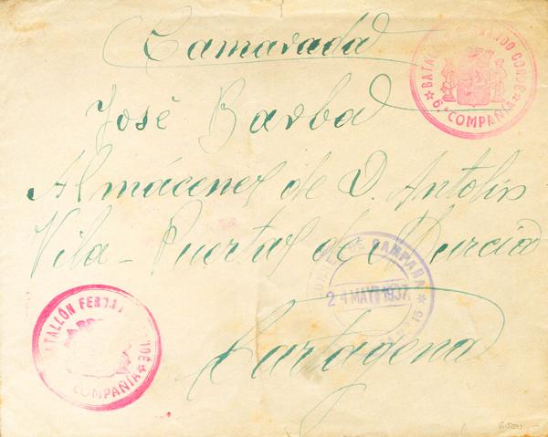 1937. COLOMERA (GRANADA) a CARTAGENA. Fechador CORREO DE CAMPAÑA / ESTAFETA Nº15 y marcas BATALLON FERNANDO CONDES / 6ª COMPAÑIA, en rojo-carmÃn, al dorso anotación manuscrita "Certifico que no hay sellos en Colomera", con marca del Consejo Municipal CENSURADA IZNALLOZ, en lila y llegada. MAGNIFICA Y RARISIMA.
