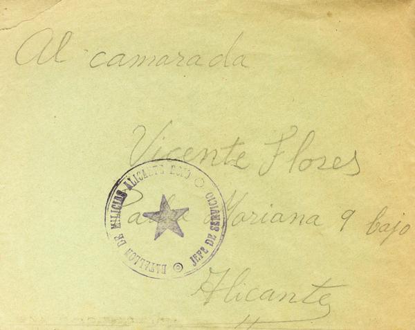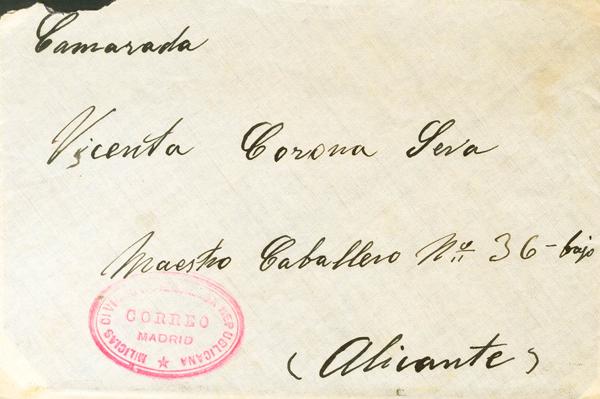 1936. MADRID a ALICANTE. Marca MILICIAS CIVILES DE IZQUIERDA REPUBLICANA / CORREO / MADRID, en carmÃn y al dorso llegada. MAGNIFICA Y RARISIMA.