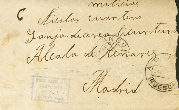 1936. AGUAS (HUESCA) a ALCALA DE HENARES. Fechador ANGÜES / (HUESCA) y marca GRUPO ANARQUISTA KROPOTKIN / F.A.I. / AGÜAS (HUESCA), en violeta, repetida al dorso junto a la llegada (este grupo de milicianos de la F.A.I., se integró en el XXI Cuerpo del Ejército de la República en Septiembre de 1937). MAGNIFICA Y EXTRAORDINARIAMENTE RARA.