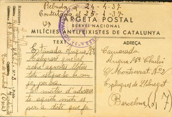 1937. Tarjeta Postal del Servei Nacional de Milicies Antifascistes de Cataluña de TARDIENTA /HUESCA) a ESPLUGAS DE LLOBREGAT (BARCELONA). Marca REGIMIENTO DE INFANTERIA U.R.S.S. Nº3 / 1ER BATALLON, en violeta (en el remite indicación manuscrita "Tren de Combat". MAGNIFICA Y MUY RARA.