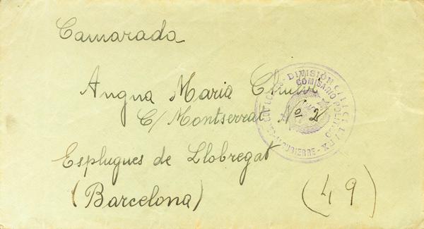 1937. Carta (con texto) de TARDIENTA (HUESCA) a ESPLUGAS DE LLOBREGAT (BARCELONA). Marca DIVISION CARLOS MARX / COMISARIO POLITICO / SECTOR ROBRES-ALCUBIERRE, en violeta, en el remite anotación manuscrita "Tren de Combat". MAGNIFICA Y RARISIMA.