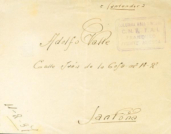 1937. Frontal dirigido a SANTOÑA (CANTABRIA). Marca COLUMNA ROJA Y NEGRA / C.N.T.-F.A.I. / FRANQUEO / FRENTE HUESCA, en violeta (esta columna formada por milicianos de la C.N.T., depende del Comité Central de Milicias Antifascistas de Cataluña y participó en el intento fallido de la isla de Mallorca, posteriormente se dirigieron al frente de Aragón, al sector de Huesca). MAGNIFICA Y RARISIMA MARCA.