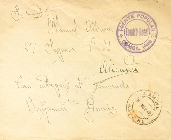 1936. CAMBIL (JAEN) a ALICANTE. Marca FRENTE POPULAR / COMITE LOCAL / CAMBIL (JAEN), en violeta. MAGNIFICA Y RARISIMA.
