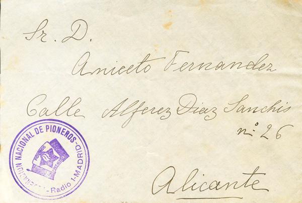 1936. MADRID a ALICANTE. Marca FEDERACION DE PIONEROS / RADIO 1 MADRID, en violeta, repetida al dorso junto a la llegada (el remite recortado). MAGNIFICA Y RARA.