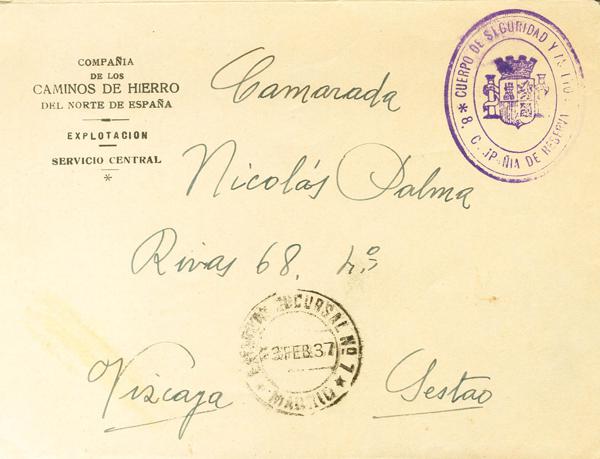 1937. 10 cts rojo del S.R.I. FONDO DE AYUDA (al dorso). Sobre con membrete Caminos de Hierro del Norte de España de MADRID a SESTAO (VIZCAYA). En el frente marca CUERPO DE SEGURIDAD Y ASALTO / 8ª COMPAÑIA DE RESERVA, en violeta y repetida sobre la viñeta, al dorso. MAGNIFICA Y MUY RARA. (Allepuz 1088, Domenech 18)