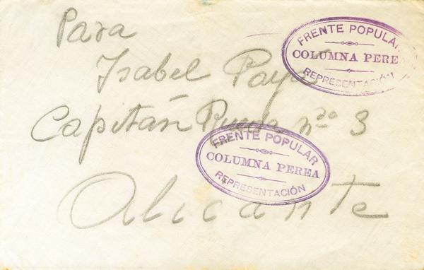 1937. MADRID a ALICANTE. Marcas FRENTE POPULAR / COLUMNA PEREA / REPRESENTACION, en violeta (esta carta fechada el 9 de Enero de 1937, está remitida desde el sector Pozuelo de Alarcón-Humera, donde esta Columna participa en la tercera Batalla de la Carretera de la Coruña, entre el 2 y 16 de Enero de 1937). MAGNIFICA Y RARISIMA.