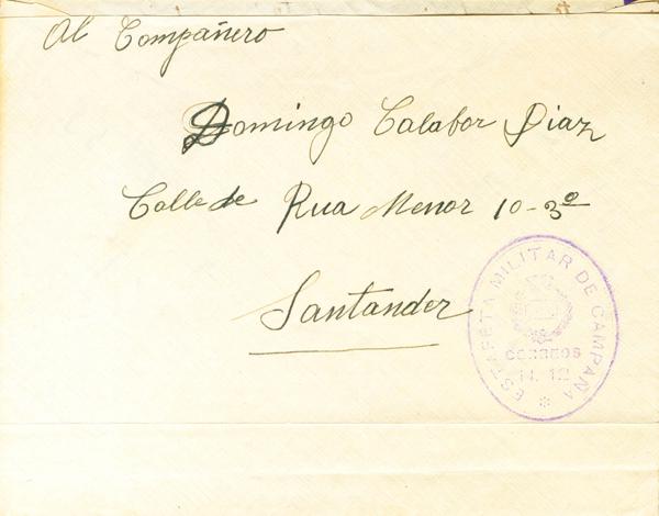 (1936ca). PAREDES DE BUITRAGO (MADRID) a SANTANDER, remitida desde el frente de Somosierra por un soldado o miliciano del Regimiento de InfanterÃa Leon Nº2. Marca ESTAFETA MILITAR DE CAMPAÑA / CORREOS / Nº12, en violeta. MAGNIFICA.