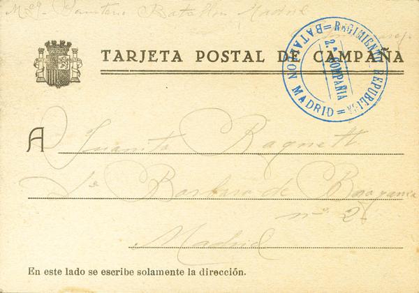 1937. Tarjeta Postal de Campaña dirigida a MADRID. Marca REGIMIENTO REPUBLICA / 2ª COMPAÑIA / BATALLON MADRID, en azul. MAGNIFICA Y MUY RARA.