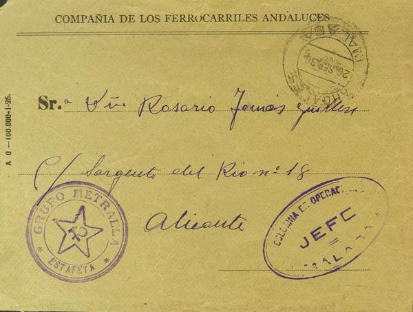 1936. Sobre con membrete de la CompañÃa de los Ferrocarriles Andaluces de ALORA (MALAGA) a ALICANTE. Fechador ARDALES / (MALAGA) y marcas GRUPO METRALLA / ESTAFETA y COLUMNA DE OPERACIONES / JEFE / MALAGA, ambas en violeta y al dorso llegada. MAGNIFICA Y EXTRAORDINARIAMENTE RARA.