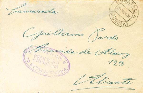 1936. MORATALLA (MURCIA) a ALICANTE. Marca FRENTE POPULAR DE / IZQUIERDAS / MORATALLA, en violeta y al dorso llegada. MAGNIFICA.