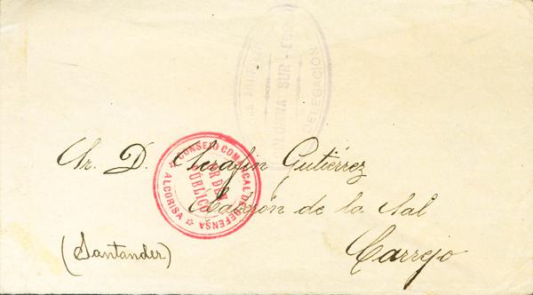 (1936ca). ALCORISA (TERUEL) a CARREJO (CANTABRIA). Marcas CONSEJO COMARCAL DE DEFENSA / ORDEN / PUBLICO / ALCORISA, en carmÃn y MILICIAS ANTIFASCISTAS / COLUMNA SUR-EBRO / DELEGACION, en violeta. MAGNIFICA Y RARISIMA.
