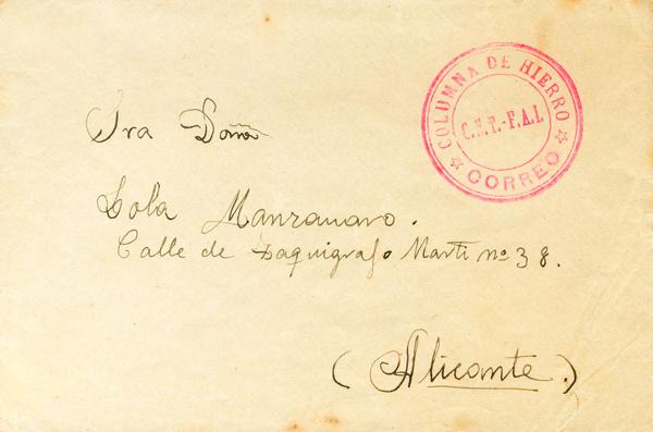 1936. PUERTO ESCANDEL (TERUEL) a ALICANTE. Marca COLUMNA DE HIERRO / C.N.T.-F.A.I. / CORREO, en carmÃn-rosa (la Columna de Hierro fue formada por milicianos de diversos pueblos y ciudades valencianas y fueron comandados por José Pellicer). MAGNIFICA Y RARISIMA.