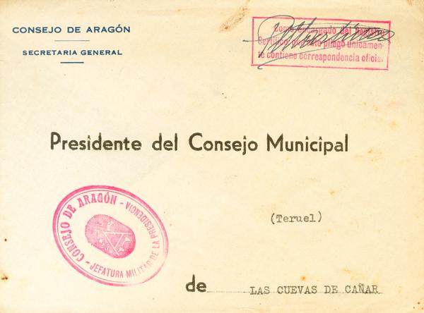 (1936ca). Dirigida a CUEVAS DEL CAÑAR (TERUEL). Marca CONSEJO DE ARAGON / JEFATURA MILITAR DE LA PRESIDENCIA, en rojo-carmÃn (el Consejo Regional de Defensa de Aragón fue constituÃdo, en su mayorÃa por miembros de la C.N.T. de Octubre a Diciembre de 1936 y con representación del resto de fuerzas antifascistas del Frente Popular desde Diciembre de 1936, fue disuelto por las autoridades republicanas en Agosto de 1937). MAGNIFICA Y RARISIMA.