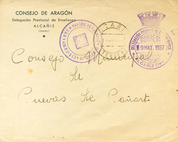 1937. Sobre con membrete CONSEJO DE ARAGON de ALCAÑIZ a CUEVAS DE CAÑART (TERUEL). Marca oficial de franquicia DELEGACION PROVINCIAL DE ENSEÑANZA / ALCAÑIZ (TERUEL) y DIVISION MACIA-COMPANYS / CENSURA DE GUERRA, ambas en violeta (esta columna se organizó en Septiembre de 1936, con milicianos de ERC y Estat Catalá y estaban al mando del Teniente Coronel Jesús Pérez Salas). MAGNIFICA Y MUY RARA.