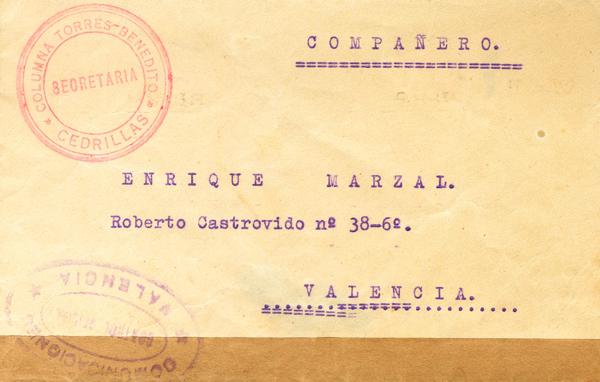 1937. CEDRILLAS (TERUEL) a VALENCIA. Marcas COLUMNA TORRES-BENEDITO / SECRETARIA / CEDRILLAS, en rojo y marca de censura de Valencia (esta columna se formó con soldados de diversos regimientos y voluntarios de C.N.T., U.G.T. y POUM, comandada por el anarquista Domingo Torres y el teniente José Benedito). MAGNIFICA Y RARISIMA.