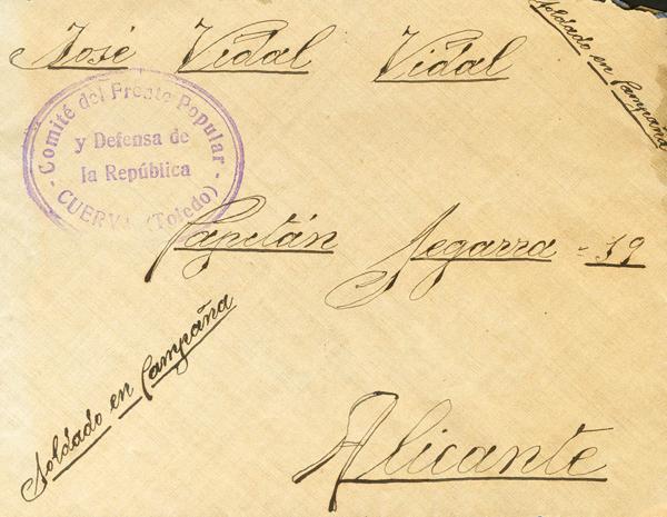 (1936ca). CUERVA (TOLEDO) a ALICANTE. Marca COMITE DEL FRENTE POPULAR / Y DEFENSA DE / LA REPUBLICA / CUERVA (TOLEDO), en violeta y anotación manuscrita "Soldado en Campaña". MAGNIFICA Y RARA.
