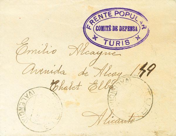 1936. TURIS (VALENCIA) a ALICANTE. Marca FRENTE POPULAR / COMITE DE DEFENSA / TURIS, en violeta y al dorso llegada. MAGNIFICA Y RARA.