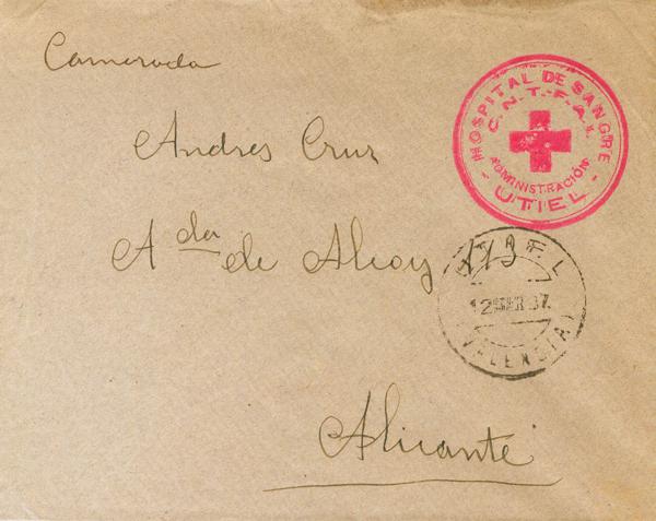 1937. UTIEL (VALENCIA) a ALICANTE. Marca HOSPITAL DE SANGRE / C.N.T.-F.A.I. / ADMINISTRACION / UTIEL, en carmÃn y al dorso llegada. MAGNIFICA Y MUY RARA.