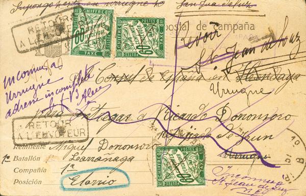 1937. Tarjeta Postal de Campaña de ELORRIO a HENDAYA (FRANCIA), reexpedida a URRUGNE y dirigida al Consul de España en esa localidad para entregar a Ricardo Dorrousoro, refugiado de Irún y remitida por su hermano que desconoce su dirección en Francia. La carta fue tasada en 1´80 fr aplicando sellos de tasa franceses y devuelta al remitente con diferentes anotaciones. MAGNIFICA Y RARISIMA.