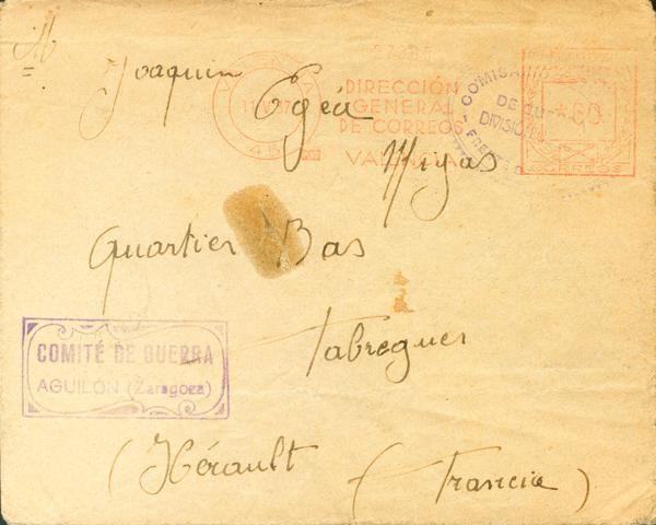 1937. 60 cts de Valencia Franqueo mecánico. AGUILON (ZARAGOZA) a FABREGUES (FRANCIA). Marcas COMITE DE GUERRA / AGUILON (ZARAGOZA) y COMISARIO DELEGADO / DE GUERRA, ambas en violeta (circulada con la franquicia postal concedida a las fuerzas leales según decreto de Agosto de 1936, pocos dÃas después de su supresión el 7 de Mayo de 1937). MAGNIFICA Y MUY RARA.
