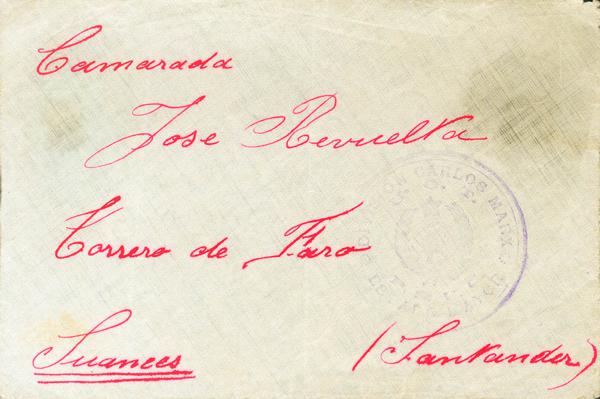 (1937ca). Frontal dirigido a SUANCES (CANTABRIA). Marca DIVISION CARLOS MARX / U.G.T. / P.S.U.C. / ESTADO MAYOR, en violeta. MAGNIFICO Y RARISIMO.