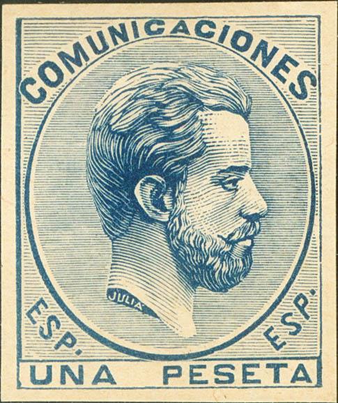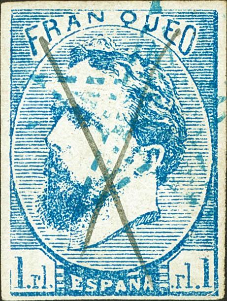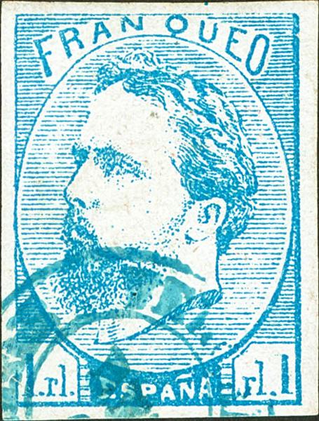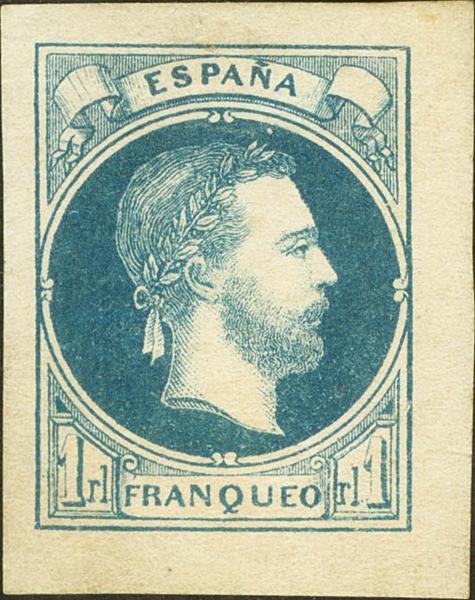 ★ 158P. 1874. 1 real azul. ENSAYO DE COLOR (grandes márgenes). MAGNIFICO Y MUY RARO. Cert. CEM.