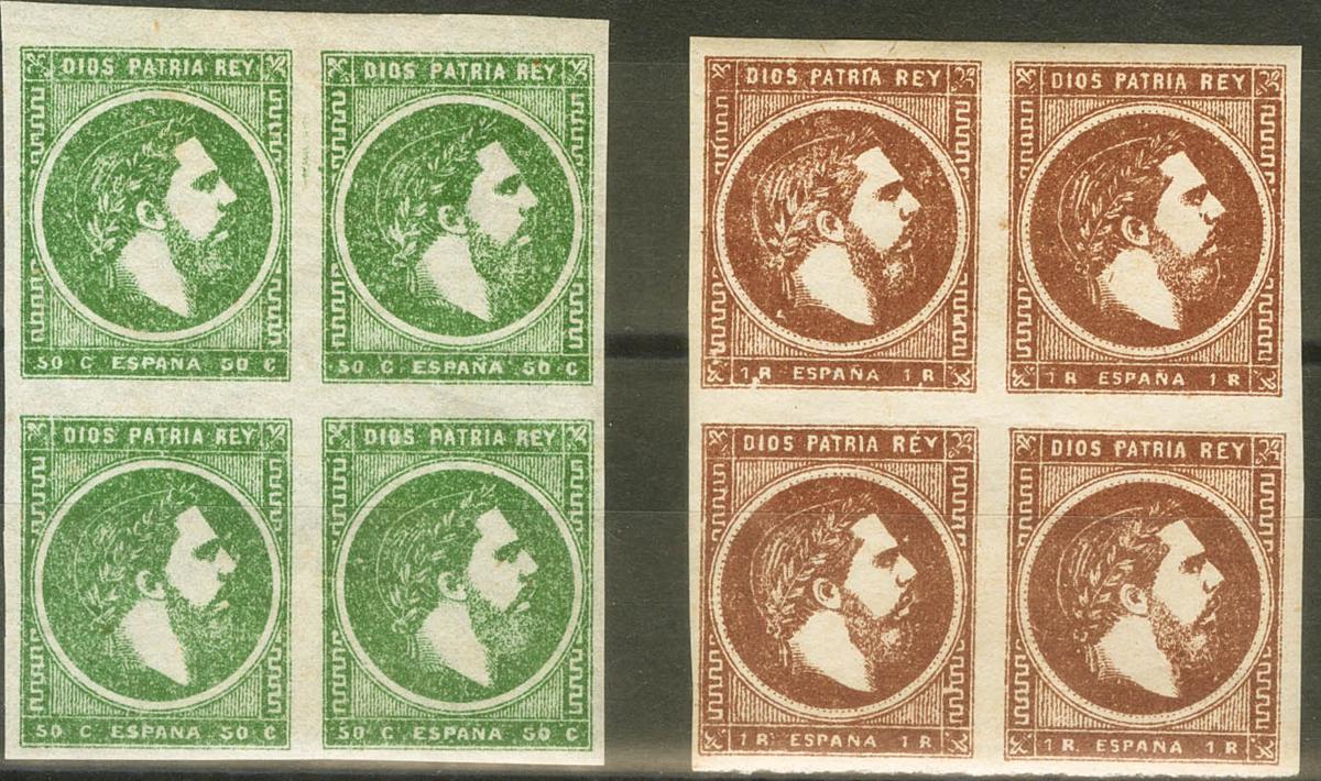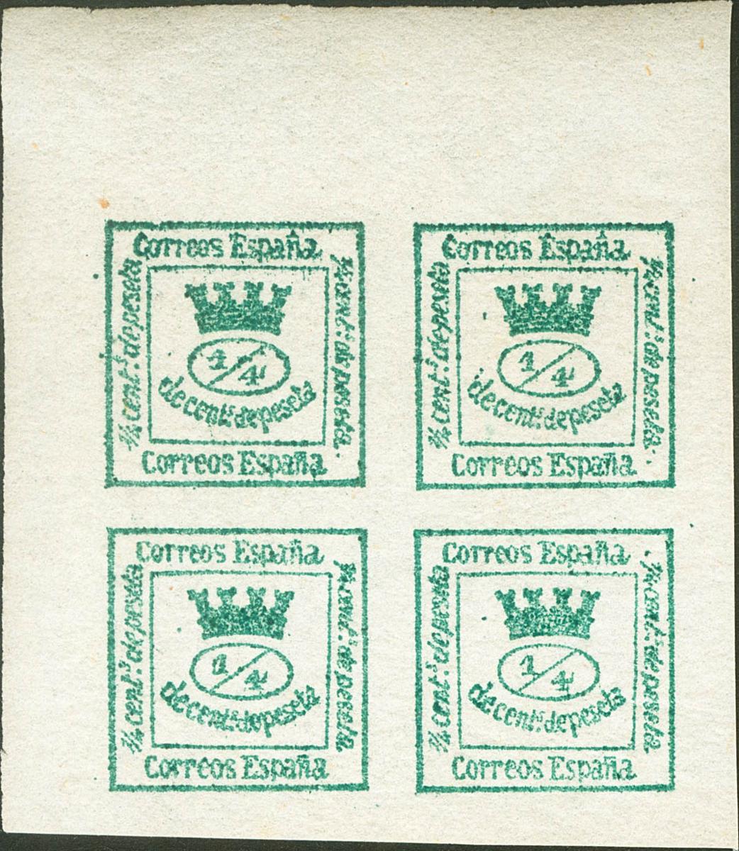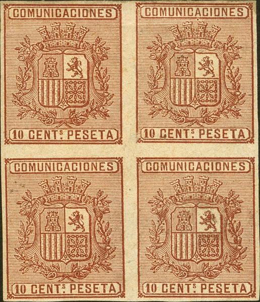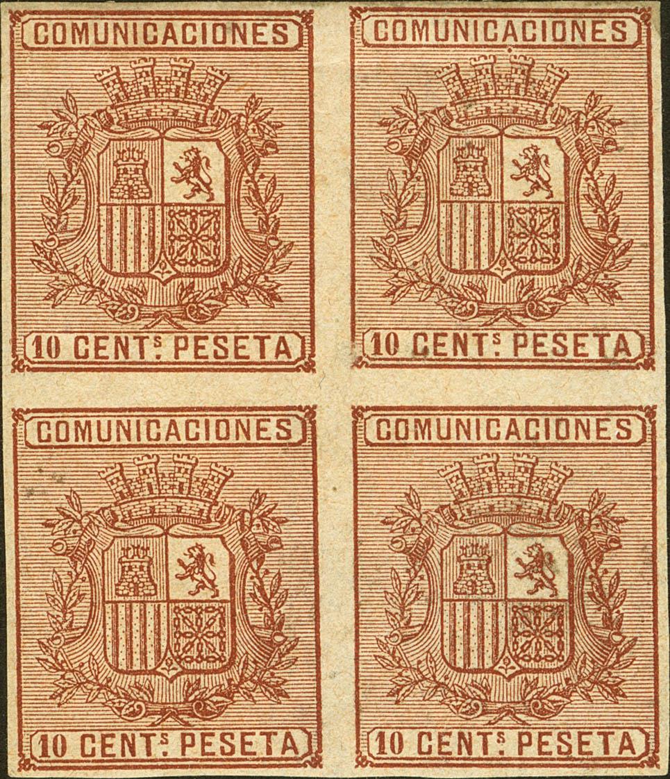 ★ 153s(4). 1874. 10 cts castaño, bloque de cuatro. SIN DENTAR. MAGNIFICO Y MUY RARO EN BLOQUE. Edifil 2022: +468 Euros