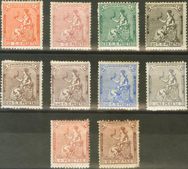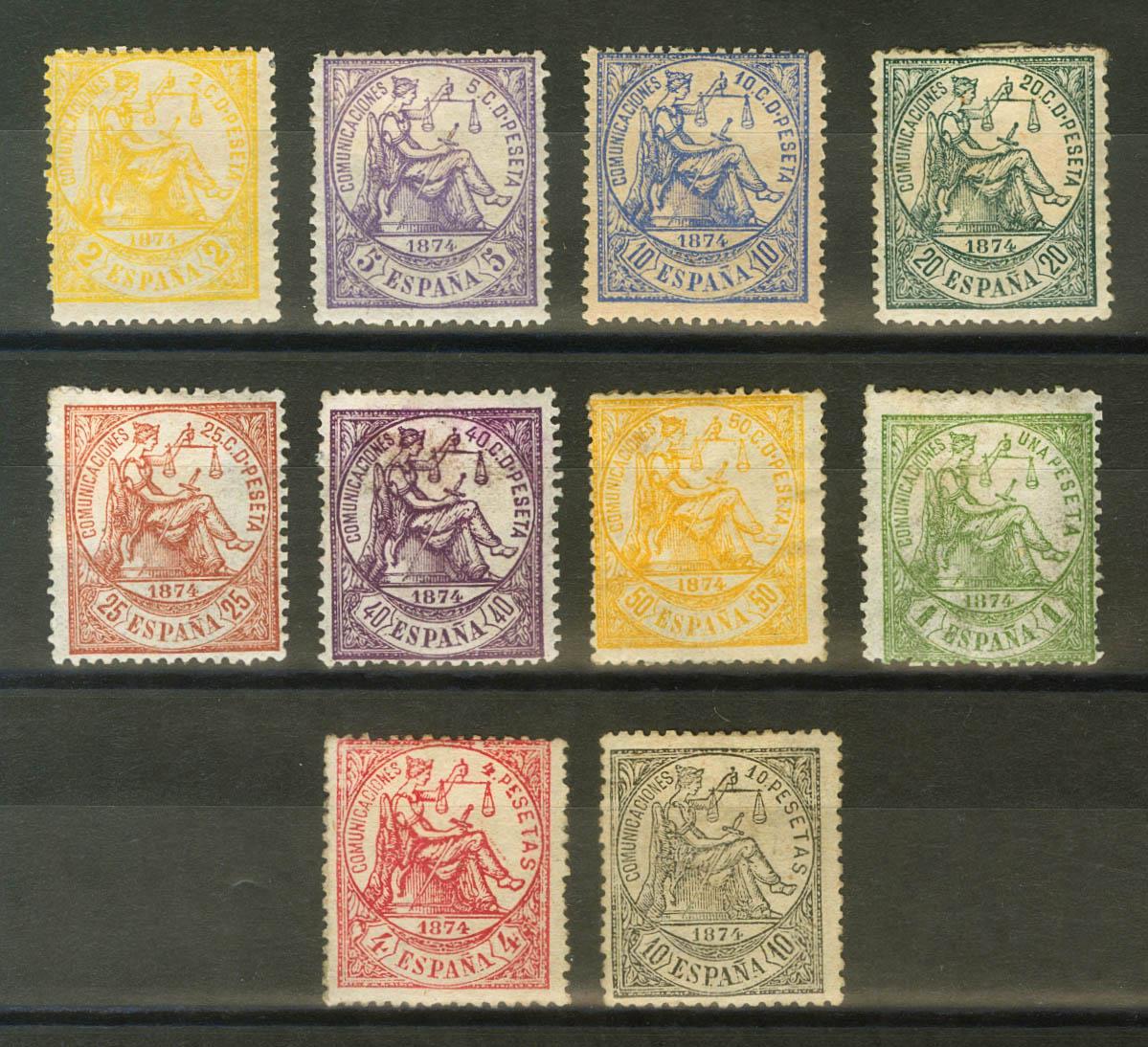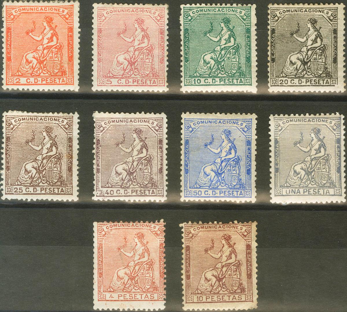 ★/(★) 143/52. 1874. Serie completa, el 10 pts se trata de un Falso Postal. Calidades diversas. MAGNIFICA.
