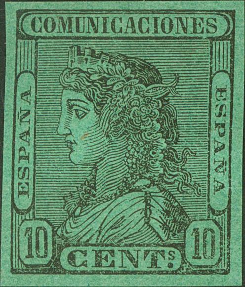 (★)1874. 10 cts negro sobre verde. ENSAYO DE COLOR, de un diseño no adoptado. MAGNIFICO. (Gálvez 948)