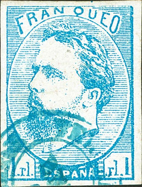 156. 1873. 1 real azul. Matasello fechador, en azul. MAGNIFICO.