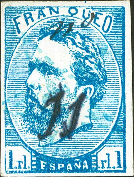 156. 1873. 1 real azul. Matasello ESTRELLA DE CINCO PUNTAS, en azul y Nº11, de Zorroza a pluma. MAGNIFICO Y RARO.
