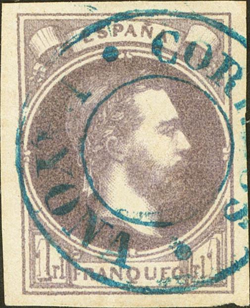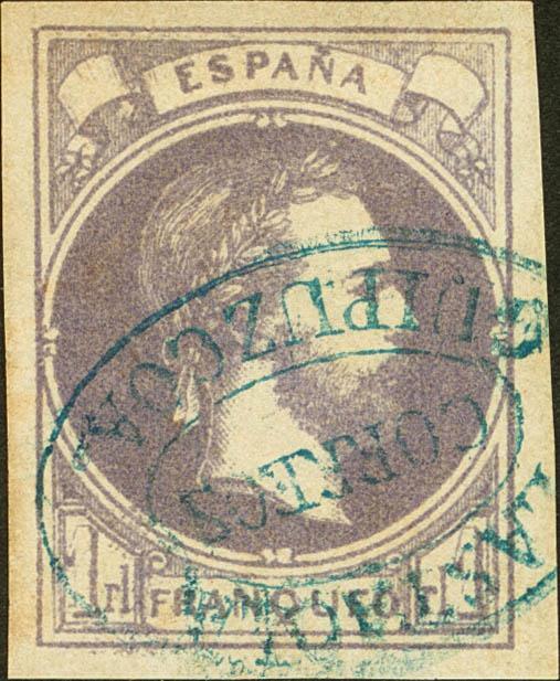 158. 1874. 1 real violeta (márgenes grandes y color intenso). Matasello LASTAOLA / CORREOS / GUIPUZCOA, en azul. PIEZA DE LUJO. Cert. CEM.