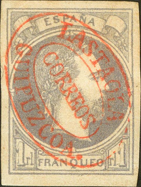 158. 1874. 1 real violeta. Matasello LASTAOLA / CORREOS / GUIPUZCOA, en rojo. PIEZA DE LUJO.