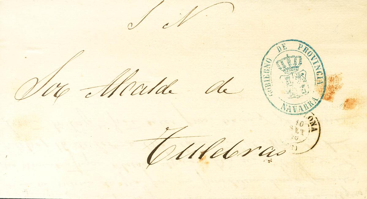 1870. (10 de Septiembre). Circular Impresa fechada en Vitoria de PAMPLONA a TULEBRAS (NAVARRA). Marca GOBIERNO DE PROVINCIA / NAVARRA, en azul. MAGNIFICA.