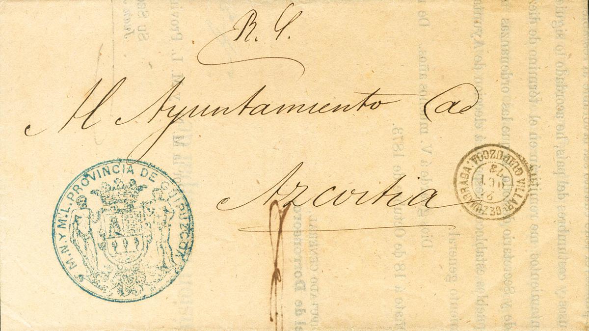 1874. (19 de Octubre). Circular Impresa de AZPEITIA a LEGAZPIA. Marca circular M.N.Y.M.L. PROVINCIA DE GUIPUZCOA, en negro y fechador AZPEITIA / GUIPUZCOA. MAGNIFICA.