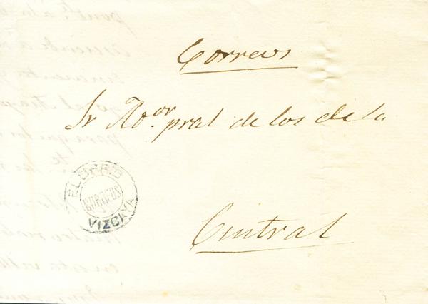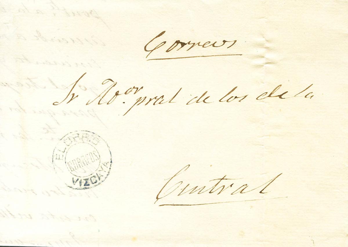 1875. (5 de Julio). CASTILLO Y ELEJABEITIA a DURANGO, circulada durante la III Guerra Carlista y dirigida al Administrador de la Central de Durango con texto "He recibido los cien sellos de un real y otros cien de medio real". Fechador CASTILLO Y ELEJ. / CORREOS / VIZCAYA, en azul. MAGNIFICA Y RARA.