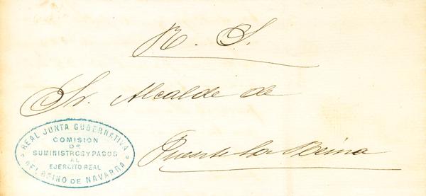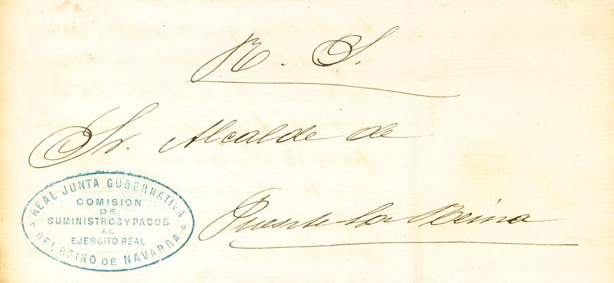 1874. (29 de Junio). ESTELLA a PUENTE DE LA REINA. Marca REAL JUNTA GUBERNATIVA / COMISION / DE / SUMINISTROS Y PAGOS / AL / EJERCITO REAL / DEL REINO DE NAVARRA, en azul. MAGNIFICA Y RARA.