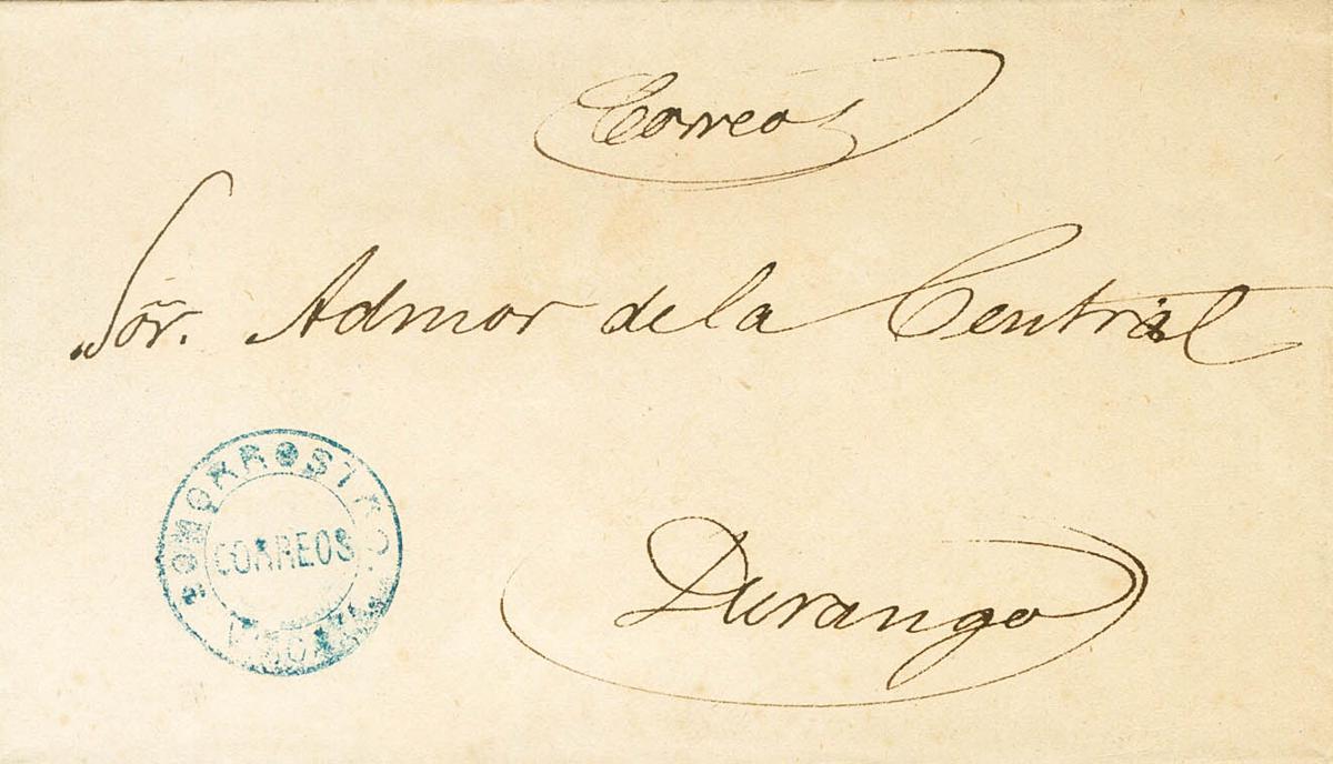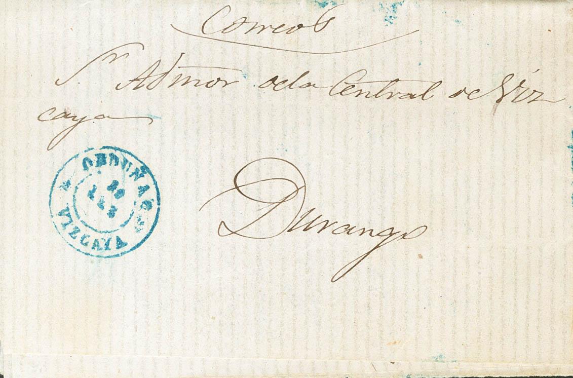 1874. (10 de Junio). ARETA a DURANGO, dirigida al Administrador Central de Durango con indicación "SÃrvame remitirme los sellos de franqueo que tenga por conveniente, cuerda y papel de estraza". Marca ARETA / CORREOS / VIZCAYA, en azul. MAGNIFICA Y RARA.