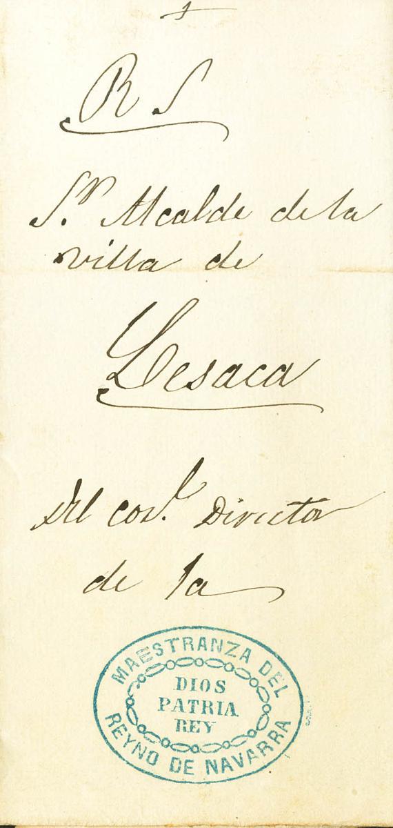 1875. (8 de Octubre). ENDARLATSA (NAVARRA) a LESACA. Marca MAESTRANZA DEL / REYNO DE NAVARRA, en azul. MAGNIFICA Y RARA.