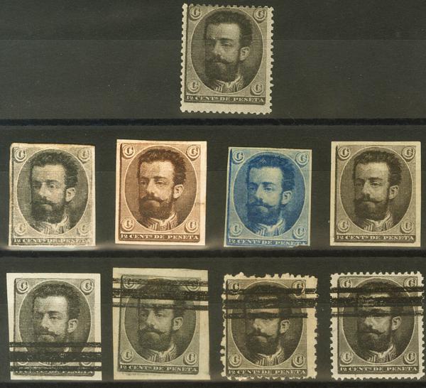 (★)1872. Conjunto de nueve ENSAYOS DE COLOR, dentados y sin dentar, de un diseño no adoptado de 12 cts, cuatro de ellos barrados. MAGNIFICOS.