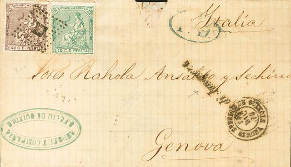 133, 136. 1873. 10 cts verde y 40 cts castaño violeta. SAN FELIU DE GUIXOLS a GENOVA (ITALIA). Matasello ROMBO DE PUNTOS (muy nÃtido) y en el frente marca VIA DI JUNQUERA, en negro. MAGNIFICA Y RARISIMA COMBINACION DE FRANQUEO PARA COMPONER LA TARIFA DE 50 CTS A ITALIA, NO MAS DE DOS O TRES CONOCIDAS.