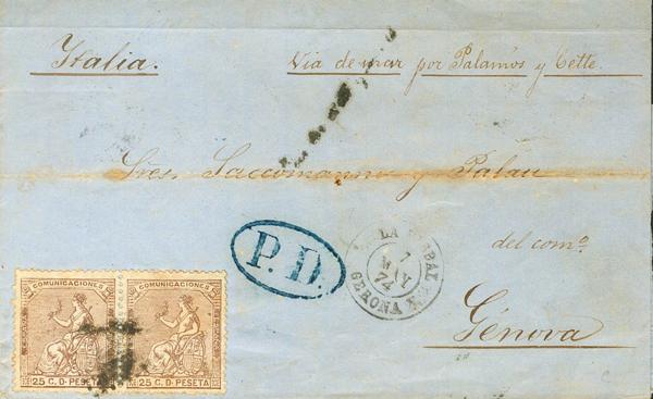 135(2). 1874. 25 cts castaño, pareja. BAGUR (GERONA) a GENOVA (ITALIA). En el frente fechador LA BISBAL / GERONA y manuscrito "VÃa de mar por Palamos y Cette". MAGNIFICA Y RARA.