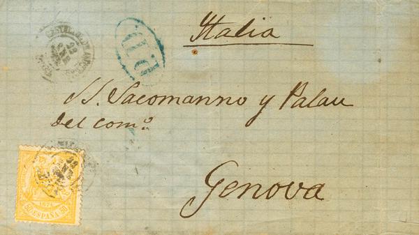 149. 1875. 50 cts amarillo. CADAQUES (GERONA) a GENOVA (ITALIA). Matasello SN FELIU DE GUIXOLS / GERONA. MAGNIFICA.