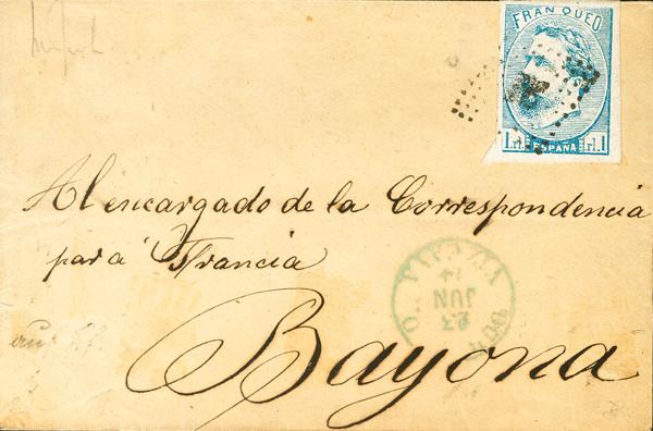 156. 1874. (23 de Junio). 1 real azul. DURANGO a BAYONA (FRANCIA). Matasello ROMBO DE PUNTOS y al dorso tránsito ALSASUA / PAMPLONA. MAGNIFICA Y RARA.
