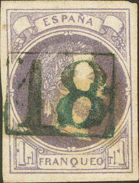 158. 1874. 1 real violeta. Matasello numeral "18", de Bermeo. MAGNIFICO Y RARO. Dictamen CEM.