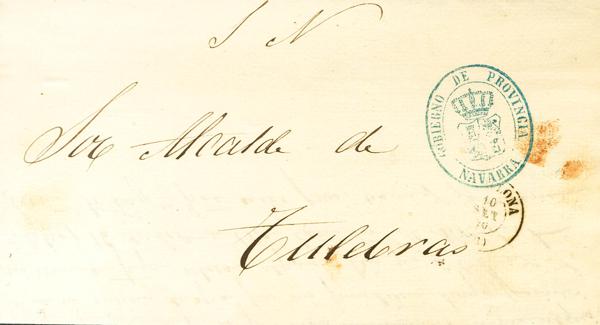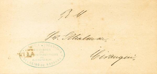 1874. (23 de Agosto). ESTELLA a CIRAUQUI (NAVARRA). Marcas REAL JUNTA GUBERNATIVA / COMISION / DE / SUMINISTROS Y PAGOS / AL / EJERCITO REAL / DEL REINO DE NAVARRA, en azul y prefilatélica ESTELLA, en negro. MAGNIFICA Y RARA.