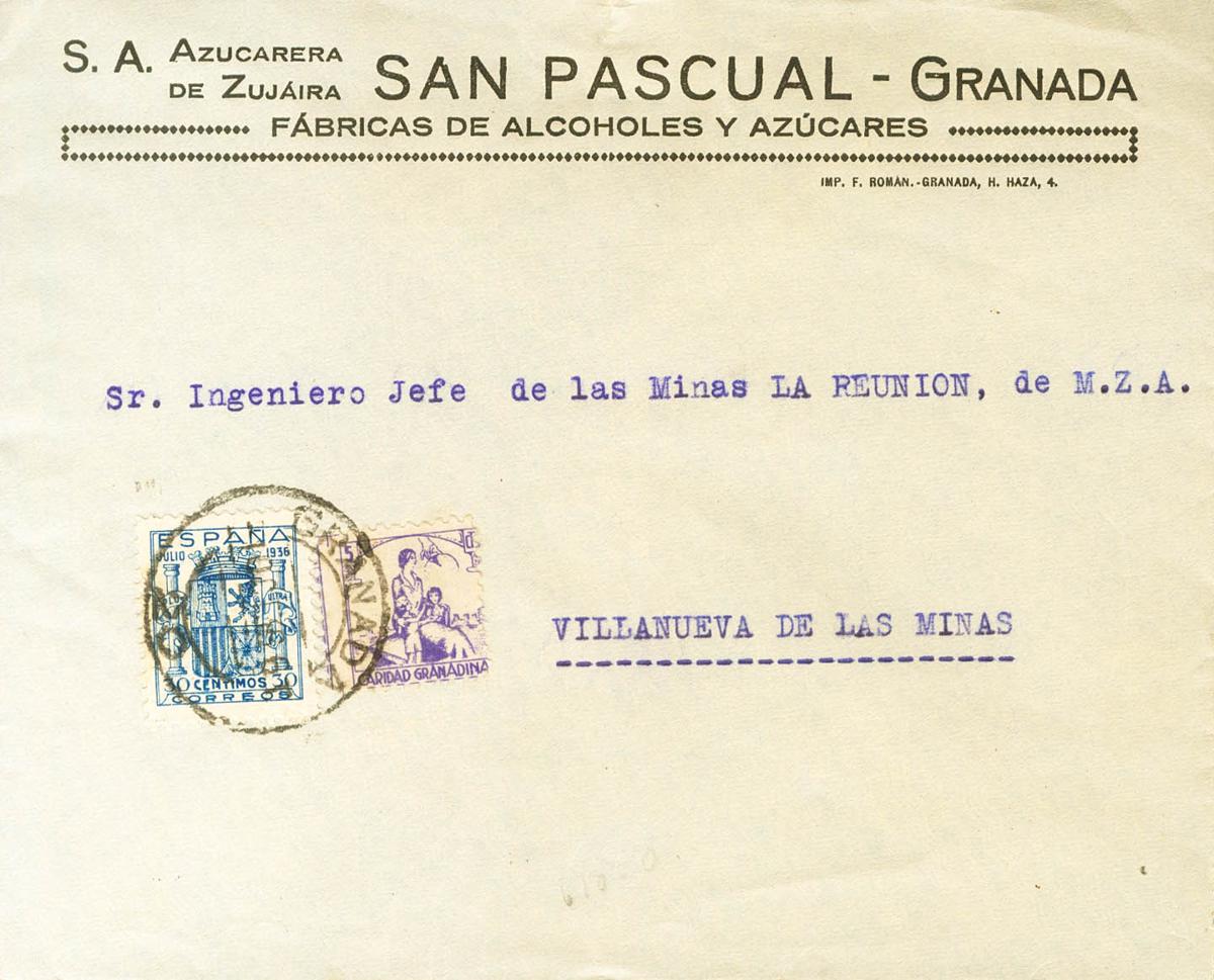 801. 1936. 30 cts azul (excelente centraje) y Benéfico de 5 cts violeta. GRANADA a VILLANUEVA DE LAS MINAS (SEVILLA). Al dorso llegada. MAGNIFICA.