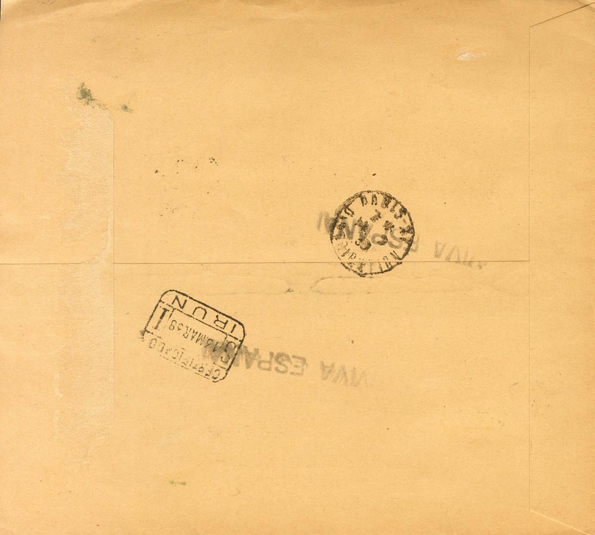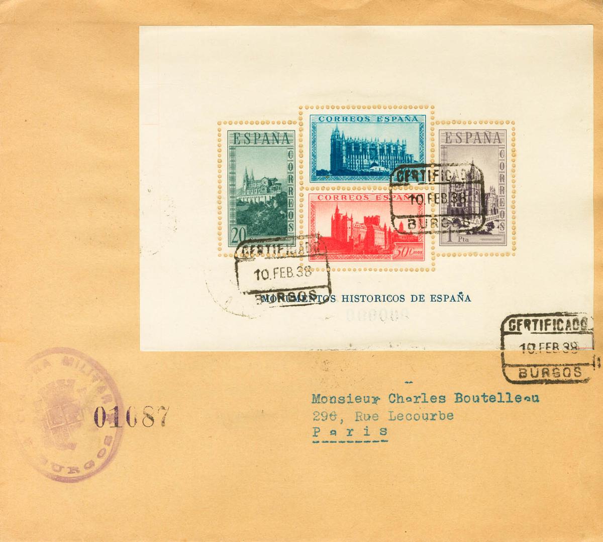 847cc. 1938. Hoja bloque COLORES CAMBIADOS. Certificado de BURGOS a PARIS (FRANCIA). Al dorso llegada. MAGNIFICA Y RARA.